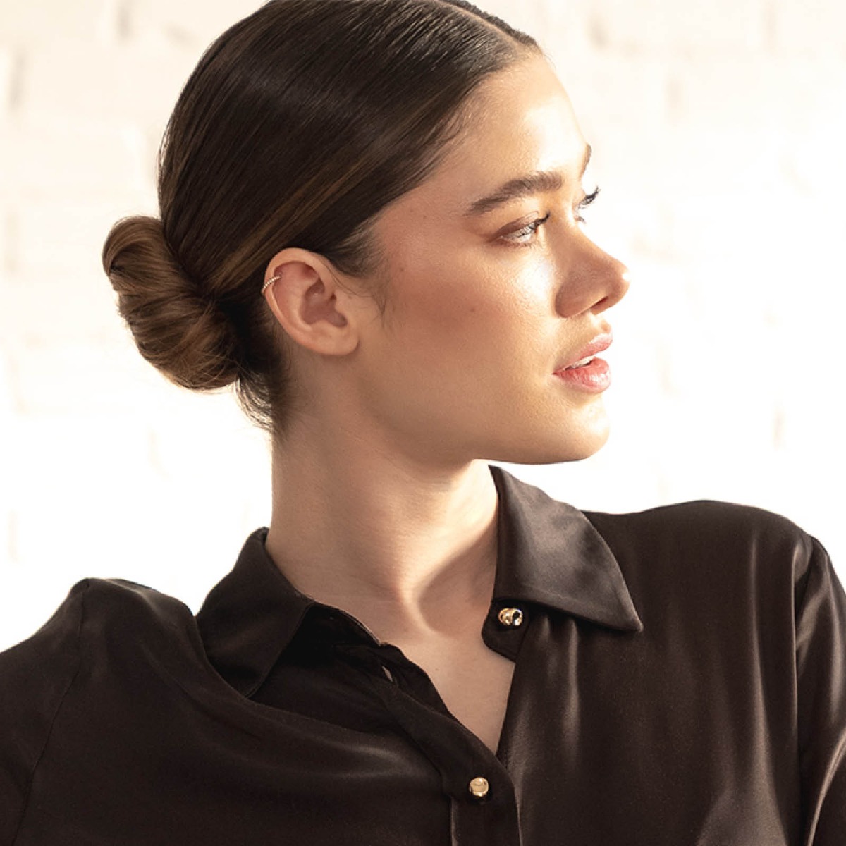 • Binde das Haar zum Schutz vor Haarbruch im besten Fall mit einem Satin-Scrunchie zu einem tiefen, glatten Dutt am Nacken.