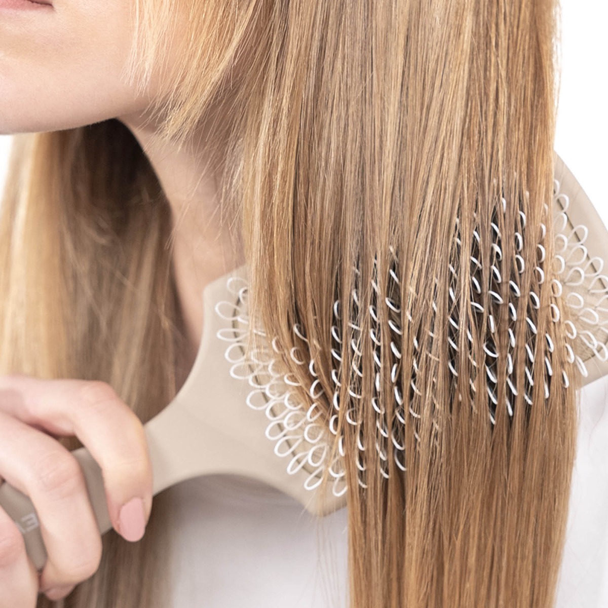 Haarverlängerungen, egal ob Bondings, Tapes, Tressen oder Clip-ins, sind nicht mit natürlichem Haar verbunden und erhalten keine direkte Nährstoffversorgung von der Kopfhaut. Daher reagieren sie empfindlich auf Reibung, Zug und ungeeignete Pflegeprodukte. Herkömmliche Bürsten können an den Verbindungsstellen ziehen, Verknotungen verstärken und Haarbruch verursachen.